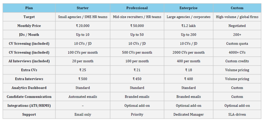 Reqruit.ai offers flexible pricing models designed to suit startups, recruitment agencies, and large enterprises.